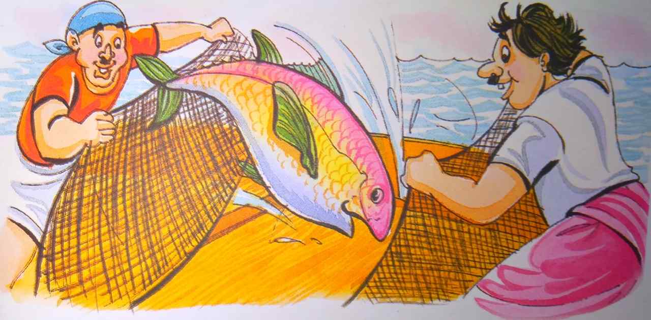 मछुआरों का एक समूह एक बड़ी मछली पकड़ने की आशा लेकर नाव पर सवार हुआ। समुद्र में नाव पर सवार वे सोच रहे थे कि काश कोई बड़ी मछली मिल जाए तो उसे बेचकर मिले धन से वे लोग भी अच्छा खाना खा सकें ।
