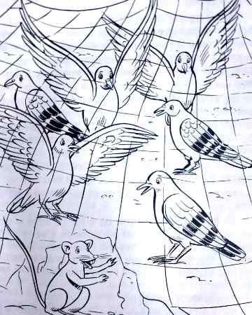 कुछ ही प्रयास के बाद हिरण्यक ने सभी कबूतरों के बंधन काट डाले, फिर वह चित्रग्रीव से बोला-‘अब तुम स्वतंत्र हो मित्र । अपने साथियों के साथ जहां जाना चाहो, जा सकते हो।