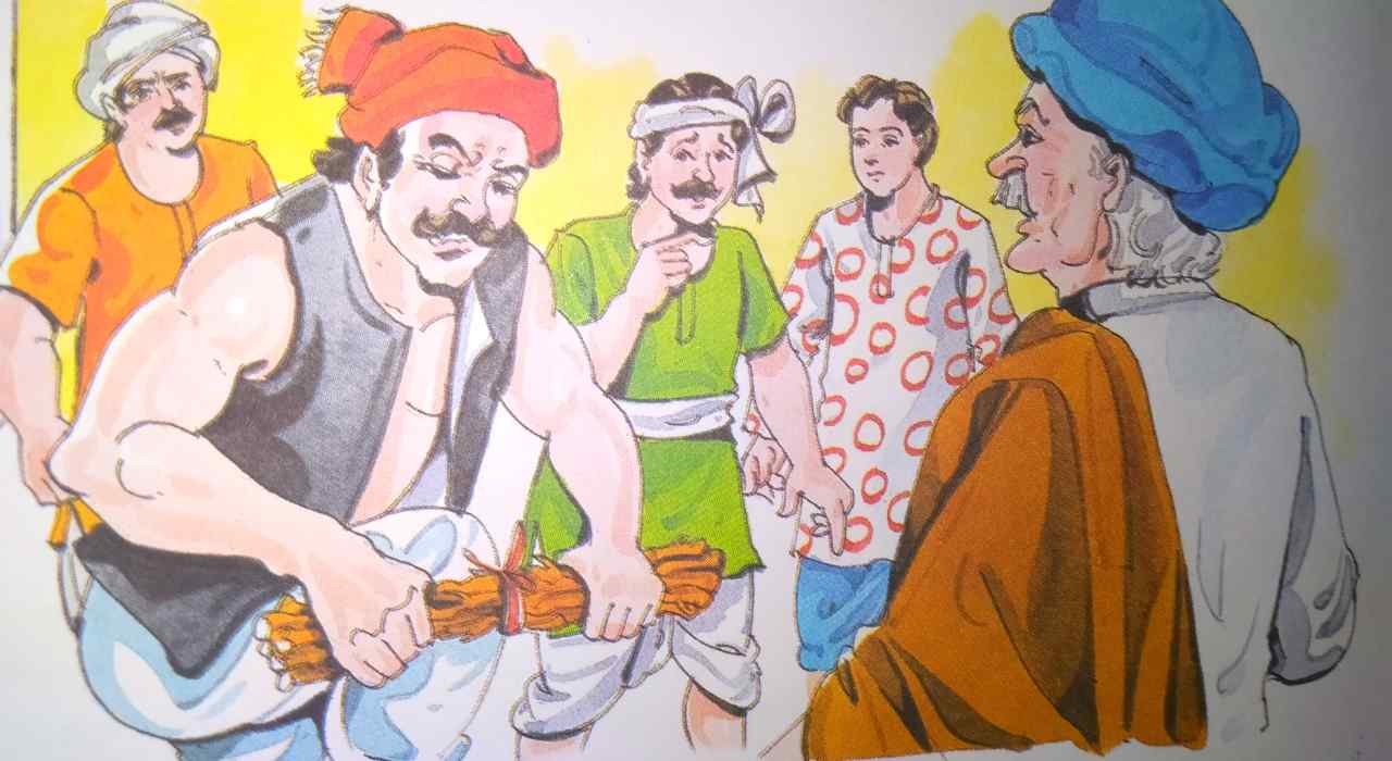 उसने चारों को अपने कमरे में बुलाया और उन्हें एक-एक लकड़ी की छड़ तोड़ने को दी। चारों ने झट से तोड़ दी। फिर किसान ने उन्हें एक-एक कर लकड़ी का गट्ठर तोड़ने के लिए दिया।