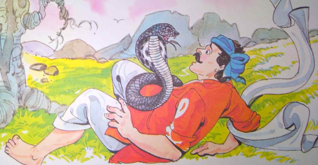 फिर वह अपने घर की ओर चल पड़ा। कुछ देर बाद बदन की गर्मी पाकर जब साँप की ठंड दूर हुई तो वह होश में आया। उसने जब स्वयं को कमीज के अंदर पाया तो उसे लगा कि कोई शत्र उसे मारने के लिए ले जा रहा है।