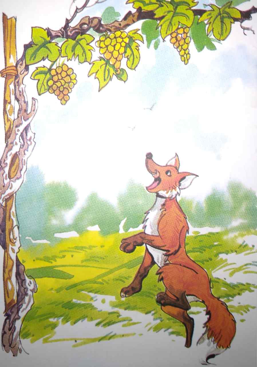एक भूखी लोमड़ी जंगल से होकर गुजर रही थी। रास्ते में अंगूर के लटकते हुए गुच्छों को देखकर लोमड़ी के मुँह में पानी आ गया। वह बोली,”ये अंगूर अवश्य ही मीठे और रसीले होंगे।”