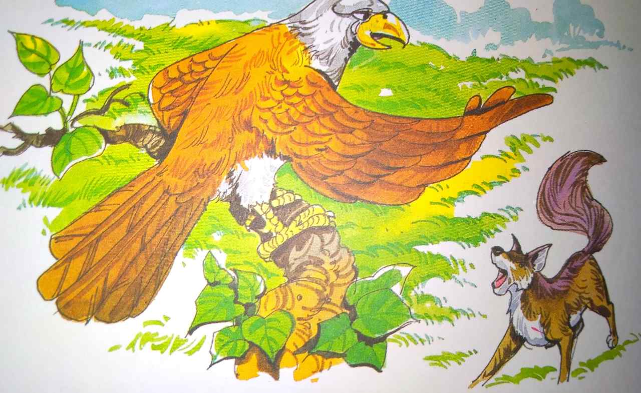 पर जब बाज ने कोई उत्तर नहीं दिया तो सियार कहीं से जलती हुई लकड़ी ले आया। उसने चेतावनी दी, “मेरा बच्चा लौटा दो, वरना इस सूखे पेड़ को आग लगा दूंगा।