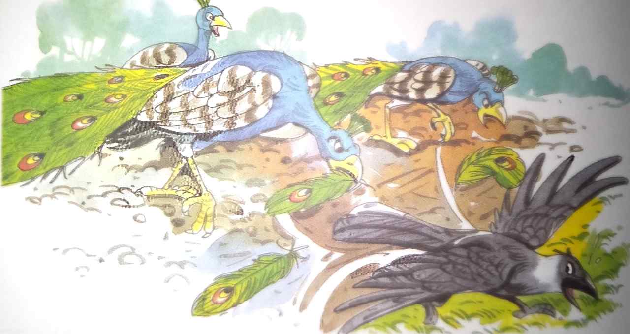 और वह वहाँ से उड़कर मोरों के झुंड में जाकर बैठ गया। मोरों ने जब मोर पंख लगाए हुए कौए को देखा तो उसकी हँसी उड़ाते हुए बोले, “इस कौए को देखो! बेचारा मोर बनना चाहता है। इसे सबक सिखाना चाहिए।”