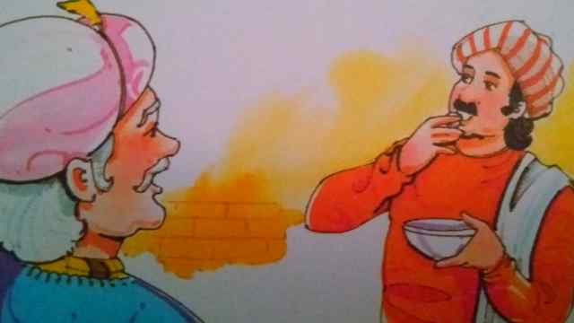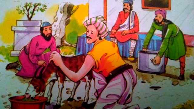 फिर से ढोलक से दोनों कटोरे लेकर उनका बारीकी से निरीक्षण करने लगे। जब उन्होंने थोड़ा सा चूना चखकर देखा, तो पाया कि वह दरअसल चूना नहीं बल्कि मक्खन था। “इनमें मक्खन भरकर लाने के लिए तुमसे किसने कहा?”