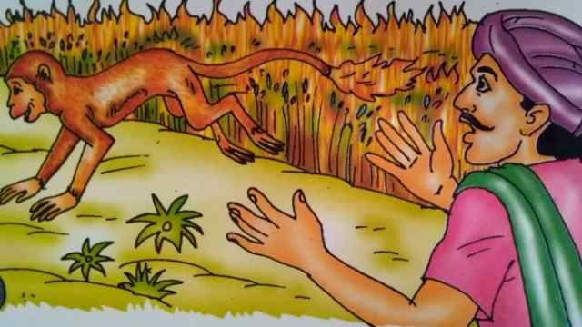अब मेरी बारी है।” यह कहकर बंदर उस किसान के गेहूँ के खेत में गया। बंदर ने अपनी जलती हुई पूँछ से पूरे खेत में इधर-उधर कूद-फाँद कर आग लगा दी और किसान के खेत की पकी हुई फसल पूरी तरह नष्ट कर दी।